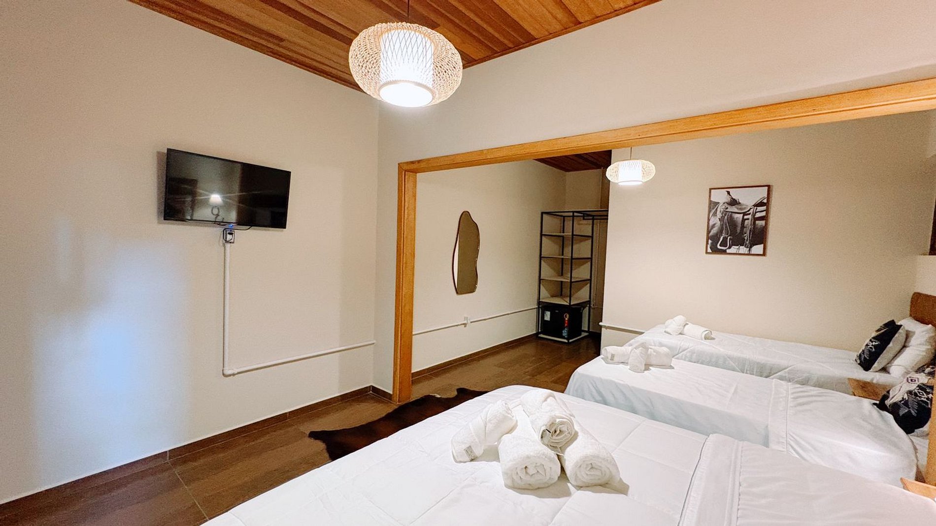 Suíte ampla e confortável dentro de um celeiro temático em um haras ativo na Serra da Mantiqueira. Acomoda até 4 pessoas com uma cama queen e duas de solteiro, unindo charme country e alto padrão de conforto. Experiência única com cavalos à porta, acesso fácil pela rodovia, próxima a Carmo de Minas e a poucos minutos de São Lourenço. Ideal para relaxar e viver o campo.
