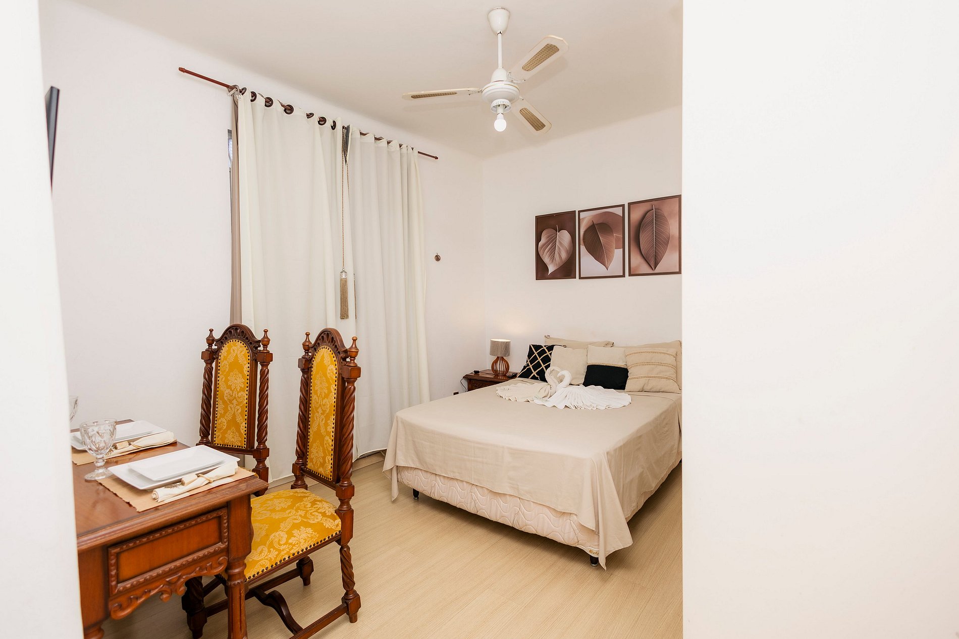 Desfrute do conforto e da praticidade nesta suíte ideal para uma estadia relaxante. Com uma cama de casal aconchegante, ar condicionado para garantir o clima perfeito, e uma TV para momentos de lazer, a suíte oferece tudo o que você precisa. O espaço inclui também um banheiro privativo, um guarda-roupas para sua conveniência e uma cozinha compacta equipada, permitindo preparar refeições rápidas e simples. Tudo isso em um hotel com localização privilegiada, perfeito para explorar a cidade.