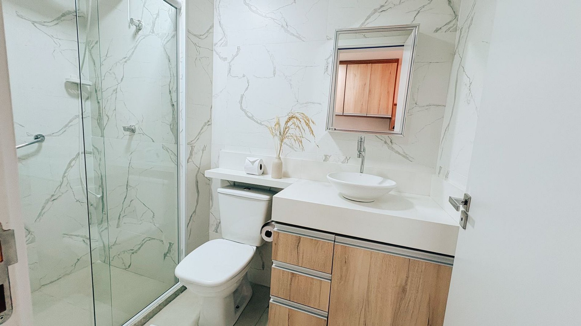 Nas áreas comuns, os hóspedes podem desfrutar de piscina, academia, espaço com churrasqueira e coworking — ambientes ideais tanto para momentos de lazer quanto para trabalho.