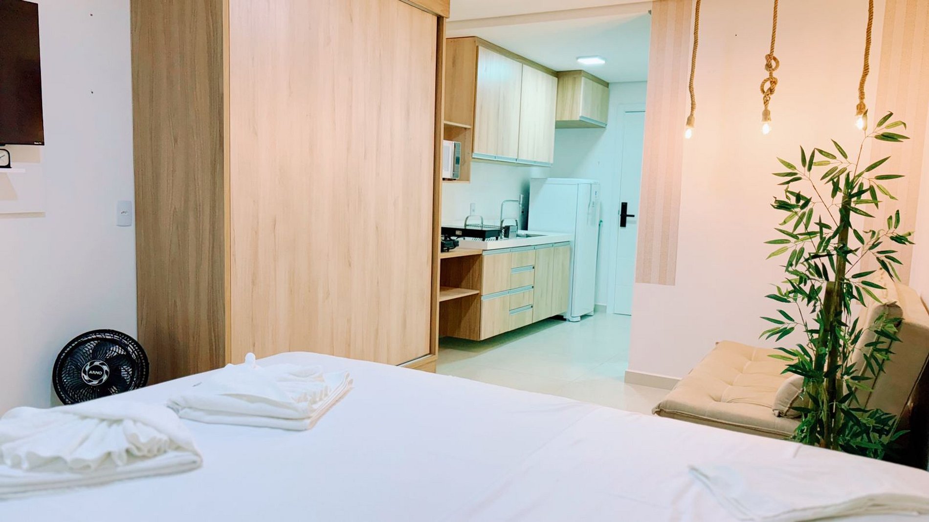 O ambiente é claro, silencioso e arejado, perfeito para descanso, trabalho ou estudo. Cama confortável, ar-condicionado, TV de tela plana, cozinha completa garantem praticidade e bem-estar. …